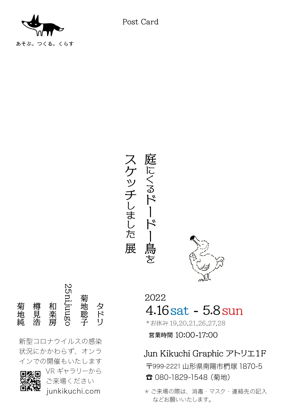「庭にくるドードー鳥をスケッチしました」展 会期/2022年4月16日(土)〜5月8日(日) 10時〜17時 *お休み、19,20,21,26,27,28 会場/Jun Kikuchi graphic 1F(山形県南陽市椚塚1870-5) 新型コロナウイルスの感染状況にかかわらず、オンラインでの開催もいたします。 Shop &Galleryからもご来場ください。