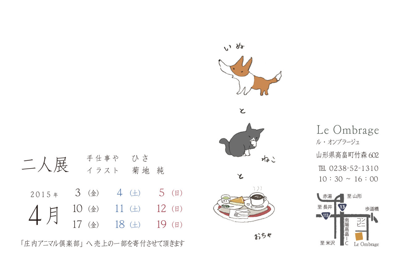 手仕事や ひさ/イラスト 菊地 純 会期:2015年4月 会場:ル・オンブラージュ(山形県高畠町竹森602) 「庄内アニマル倶楽部」へ売上の一部から12,600円を寄付させて頂きました。